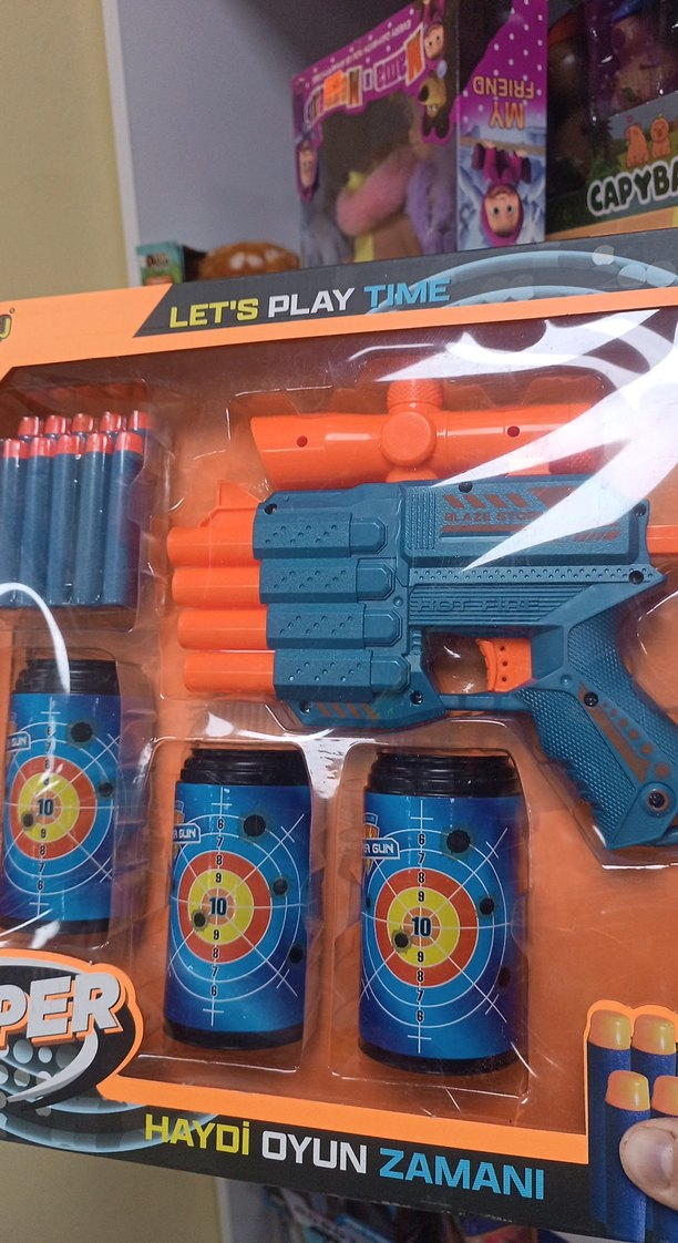 Çok namlulu mavi oyuncak tabanca, üç hedef kutusu ve köpük mermiler içerir. Üzerinde hedef baskıları bulunur.