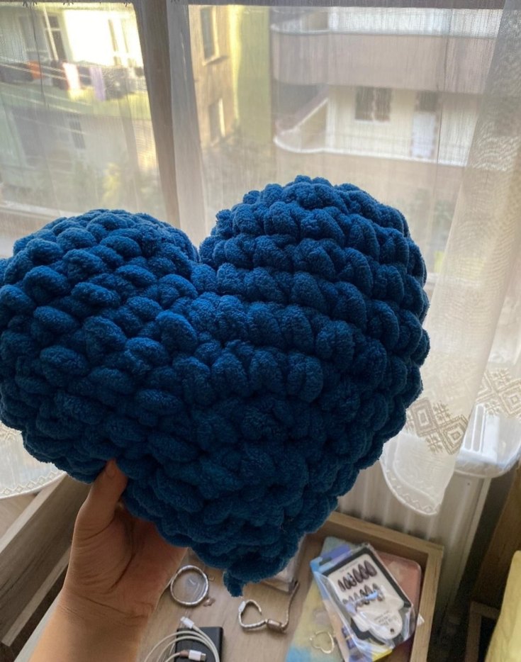 Yumuşak ve renkli mavi kalp şeklinde yastık istenilen renkte örülür alize pufy ipten içi elyaf dolguludur.