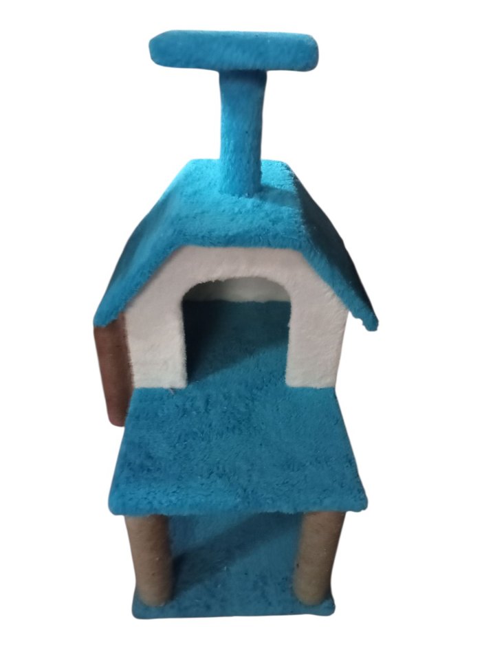 Yumuşak kumaş kaplı, mavi renkli kedi tırmalama evi. Üstünde dinlenme alanı ve rahat giriş bulunur.