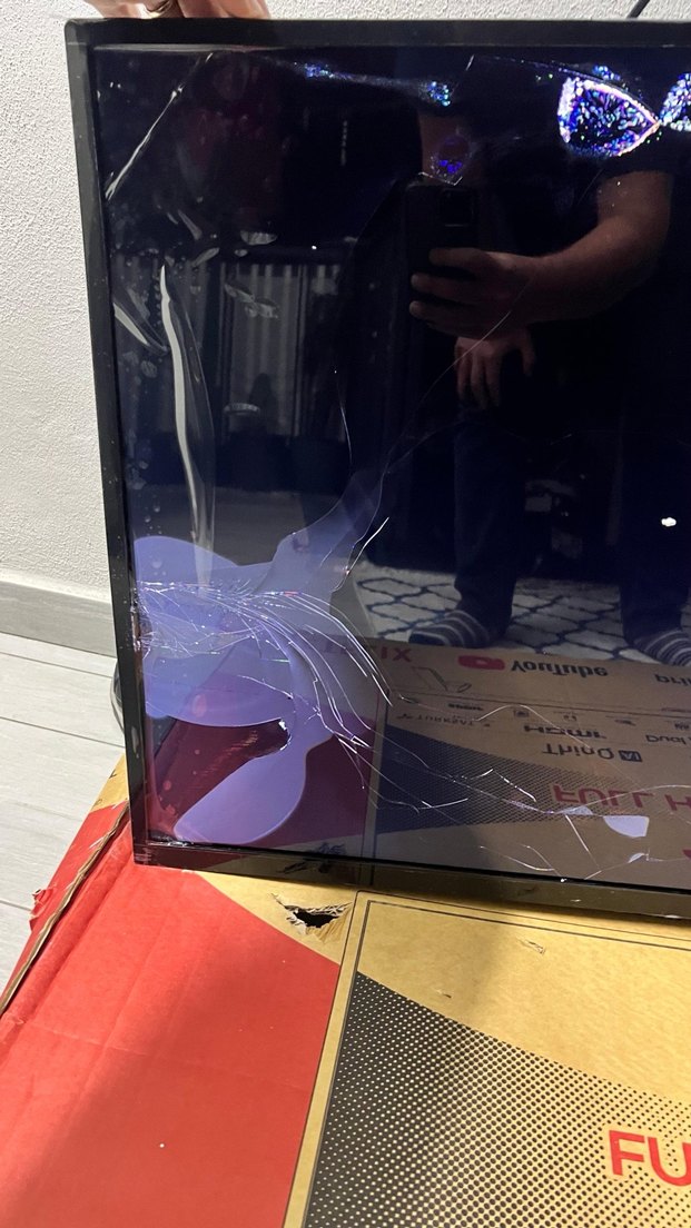 Mavi renkte, ekranın sol alt kısmında çatlaklar bulunan monitör. Ekran hasarlı, çerçeve sağlam. Yeni aldık fakat ekranı kırık çıktı değişim yapılmadı. Bu tarz elektronik ürünler bazen alınıp tamir ediliyor diye uygulamaya koydum.