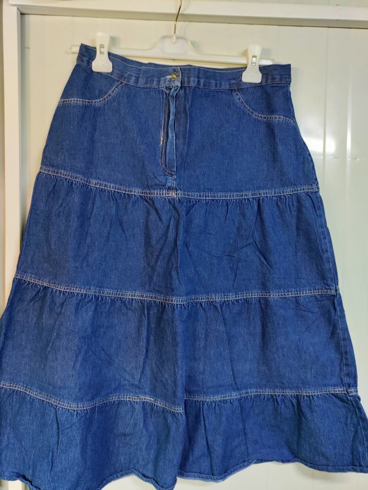 Mavi kot kumaştan yapılmış, volan detaylı ve bol kesimli midi etek. Gündelik kullanıma uygundur. teyit etmek için lütfen ölçü isteyiniz.