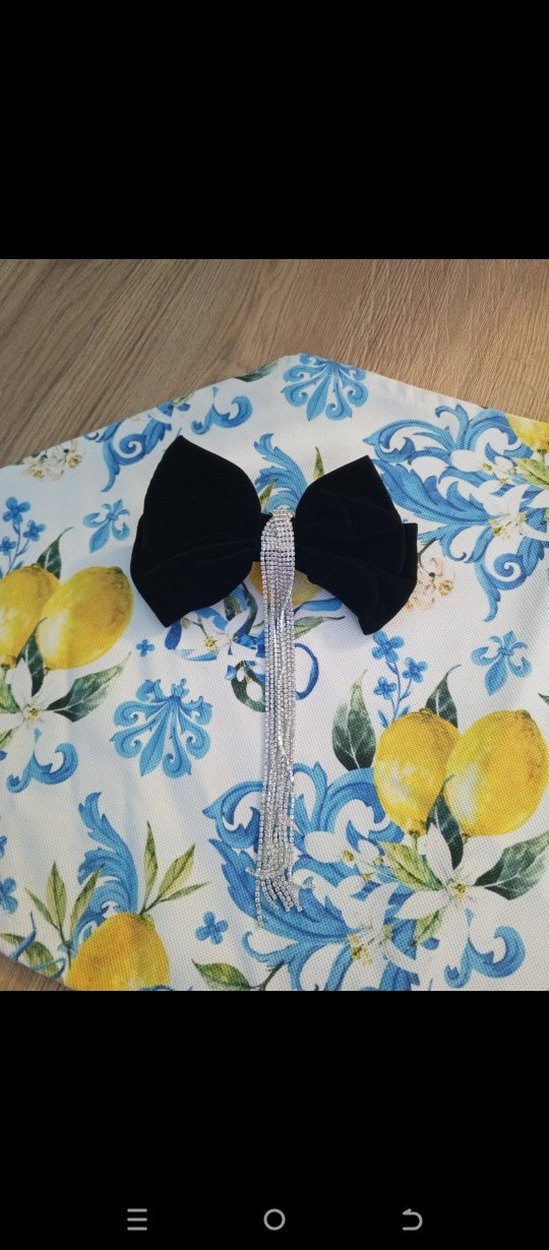 Mavi renkli kumaştan yapılmış fiyonk ve sarkan gümüş zincirler içeren saç aksesuarı, geleneksel ve avangart tarzı bir araya getirir. Trendsetterlar için ideal.