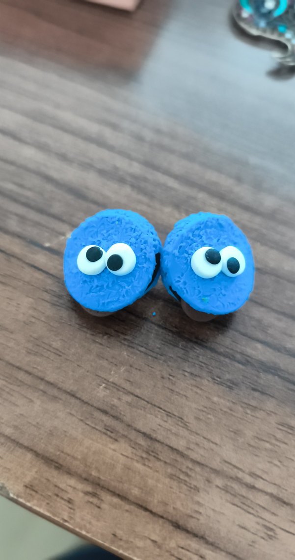 Renkli ve rahat tarzda, mavi renkte, oyuncu göz detaylı erkek küpeleri. Sade ama benzersiz bir görünüm sunar. El emeğidir