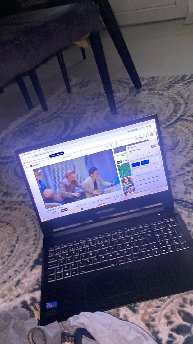 Mavi renkte, aydınlatmalı klavyeye sahip ve ekranda video oynatan bir laptop. Halının üzerinde, mobilyaların yanında konumlanmış.