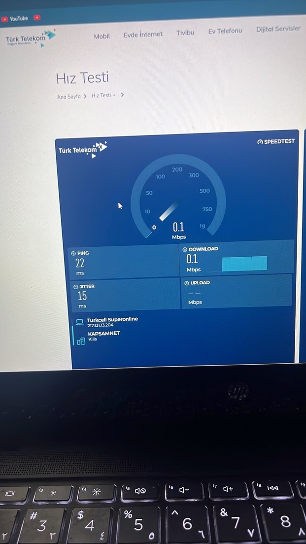 Mavi renkte monitör, hız testi ekranı gösteriyor. Ekranda 0.1 Mbps indirme hızı ve 22 ms ping değerleri yer alıyor.