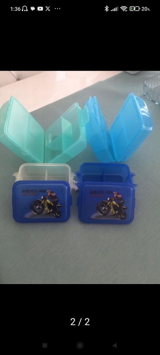 Renkli mavi kapaklı, üzerinde motor resmi ve 'DAIKNESS-M' yazısı bulunan, bölmeli yiyecek kapları.