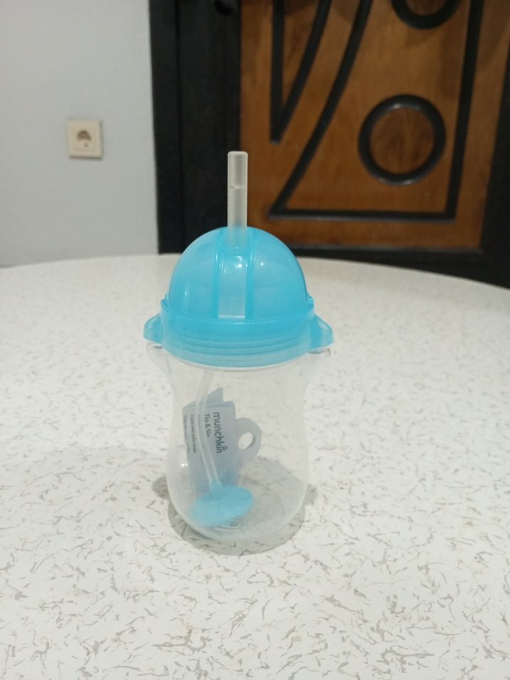 Mavi kapak ve pipetli, kolay içim için tasarlanmış renkli bebek biberon . Şeffaf gövdesi ve güvenli kapağı vardır. kapak kilidi ve temizleme fırçası yok tur