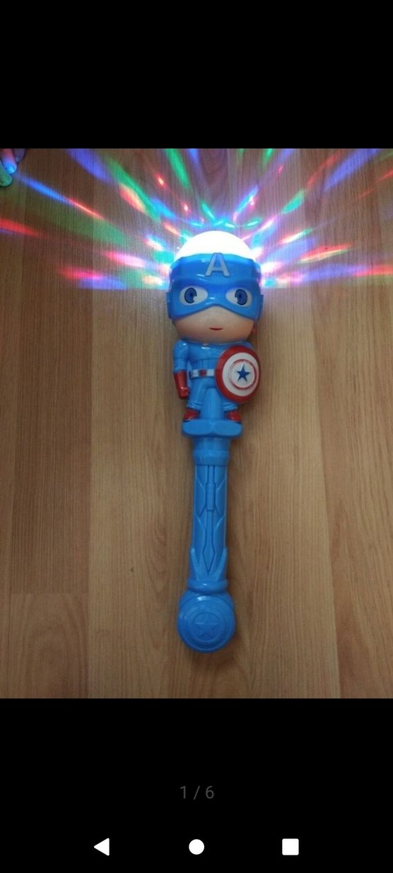 Renkli ışık efektleri yayan, kahraman figürlü mavi renkli müzikli oyuncak. kullanıma engel bir sorunu yoktur