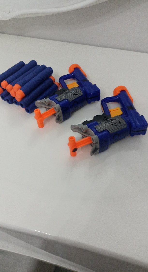 İki adet mavi oyuncak tabanca ve turuncu uçlu yumuşak mermilerden oluşan renkli bir oyun seti. NERF 15 adet mermisi ile alıcıya gönderirken 5 adet hediye mermi eklenecektir