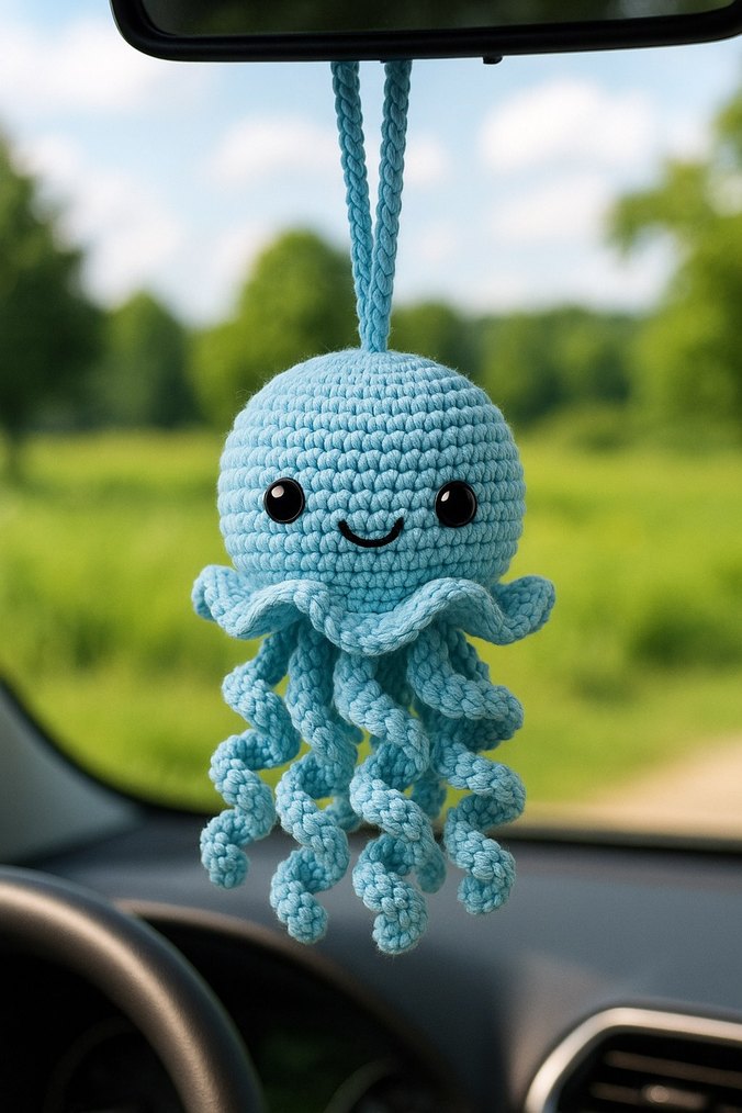Renkli, mavi örgüden yapılmış, kıvrımlı dokunaçları ve gülümseyen yüzü olan peluş ahtapot oyuncak. Asmak için uygun.