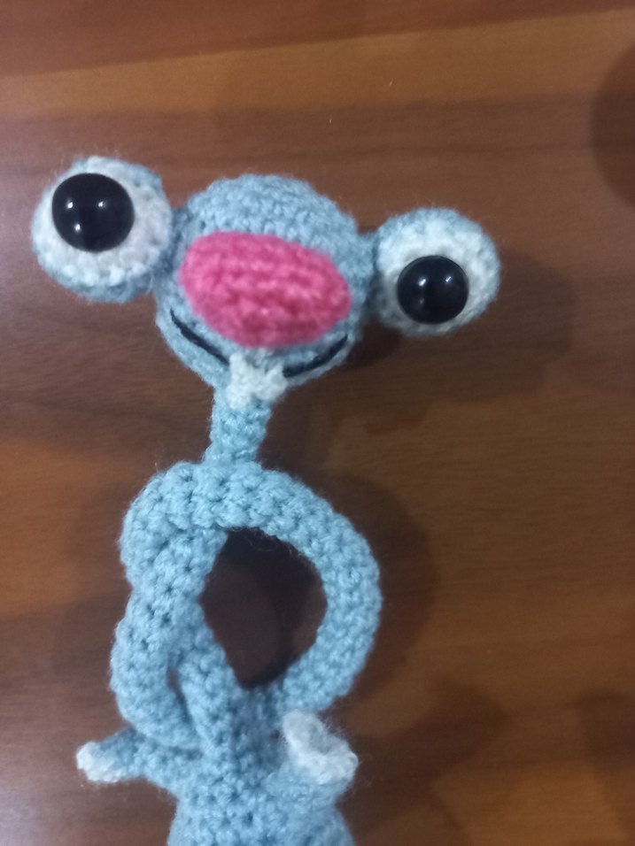Büyük gözlü ve renkli pembe burunlu gri el örgüsü peluş oyuncak. Yumuşak ve hafif, sevimli bir koleksiyonluk. amigurumi, miskin sid#sid#buzdevri.boy28cm,boyun 20cm
