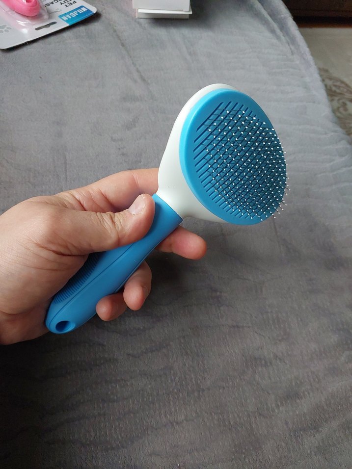 Metal kıllara ve rahat tutuşa sahip mavi renkli kedi tüy fırçası. Canlı renk neşeli bir hava katıyor.
