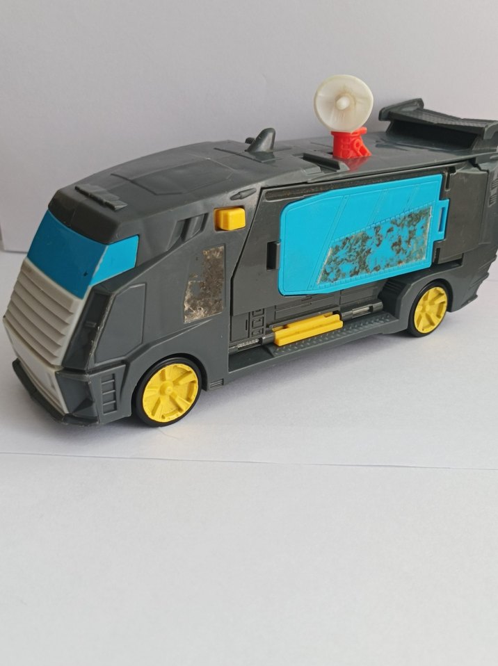Mavi gövdesi, sarı tekerlekleri ve siyah tavanı olan renkli oyuncak araba, üzerinde beyaz ve kırmızı minyatür anten bulunur.