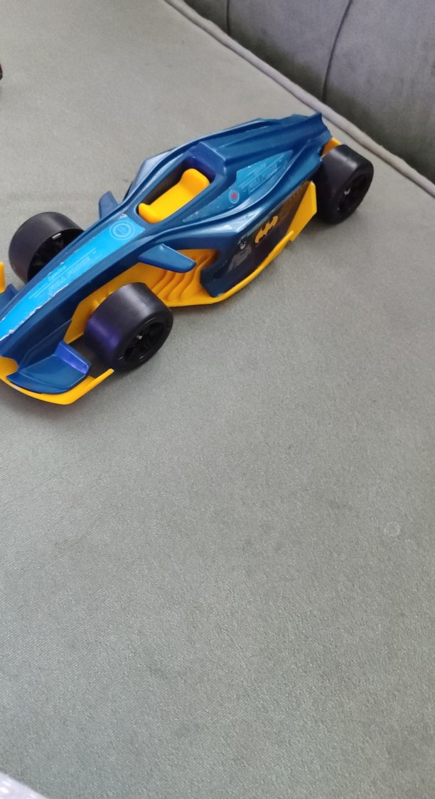 Siyah tekerlekli, sarı detaylı, renkli mavi oyuncak yarış arabasıdır.