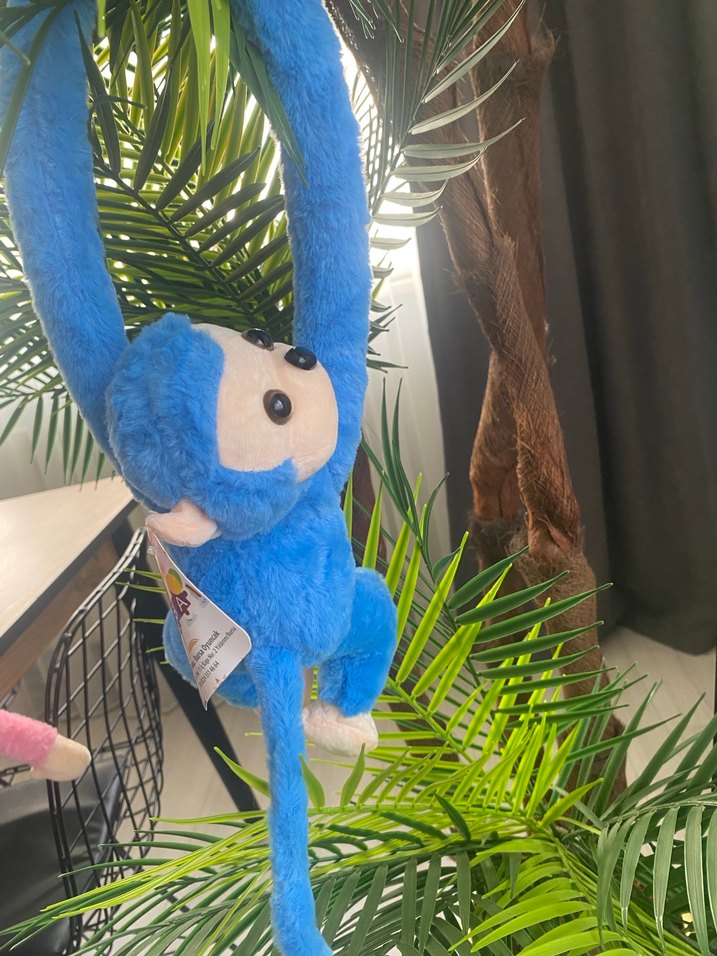 Uzun kollu, mavi renkli peluş maymun oyuncak. Yumuşak dokusu ile sevimli ve eğlenceli bir tasarıma sahiptir sesli maymun .