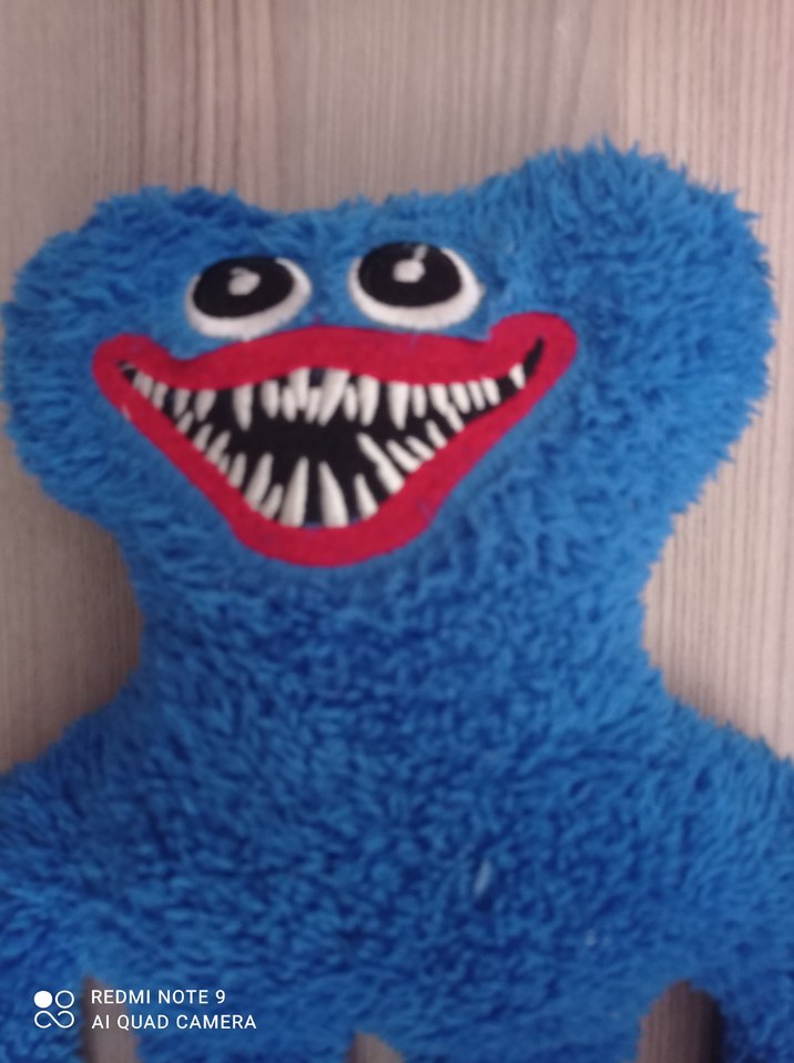 Yumuşak dokulu, renkli mavi peluş oyuncak, büyük gözler ve dişli geniş ağız detaylarına sahip.