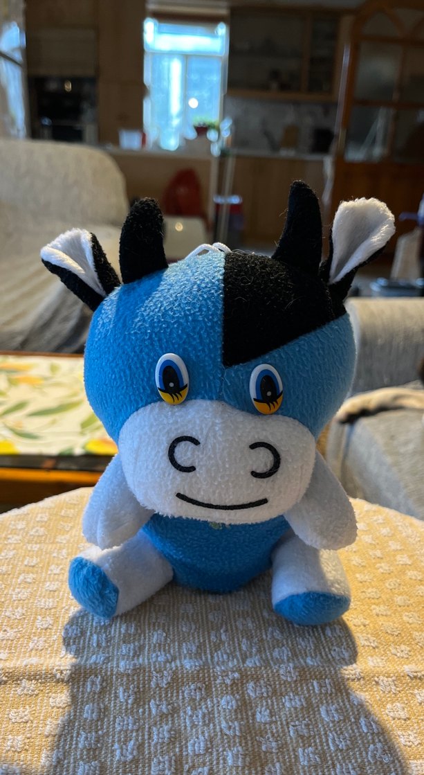 Yumuşak kumaştan yapılmış, siyah boynuzlu ve canlı gözlü mavi beyaz renkli peluş oyuncak inek.