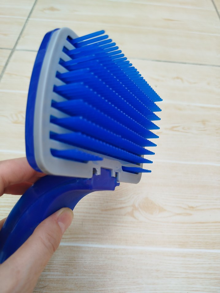 Renkli mavi plastikten yapılmış, sapı ve düz dikdörtgen yüzeyi olan çok amaçlı bir köpek tarağı