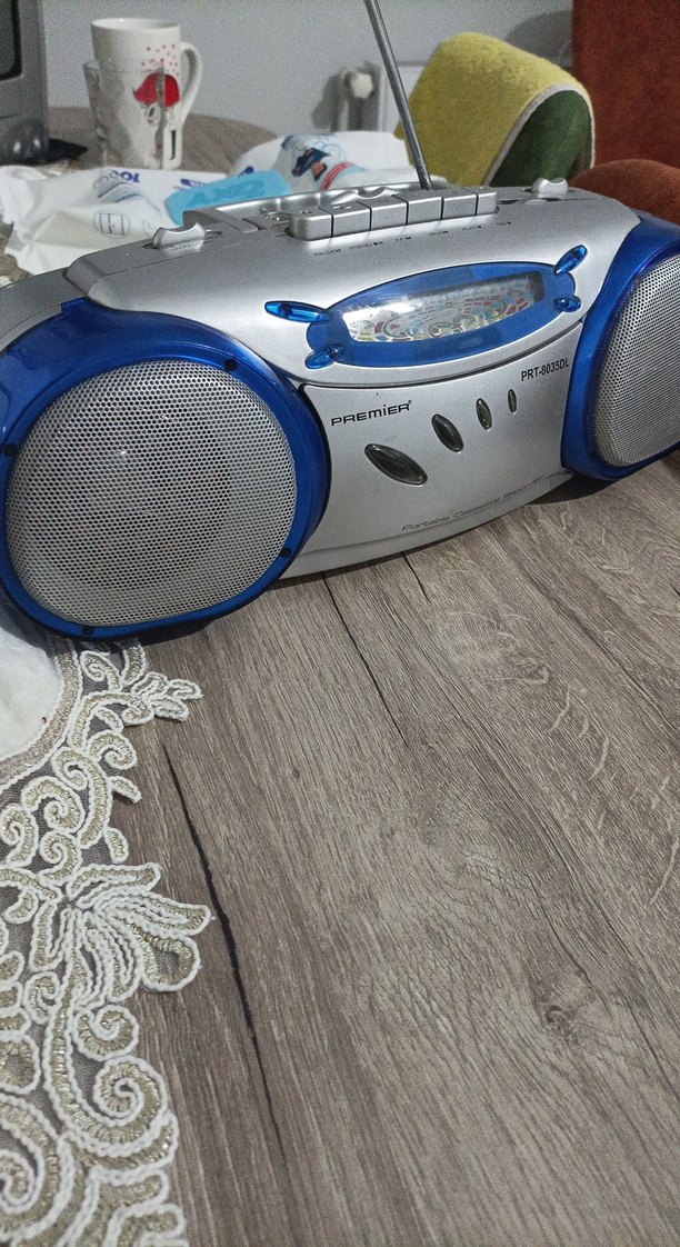 Üstte kontrol düğmeleri ve yerleşik hoparlörlere sahip, renkli mavi Premier müzik sistemi. Retro tarzda ses oynatımı için uygun.