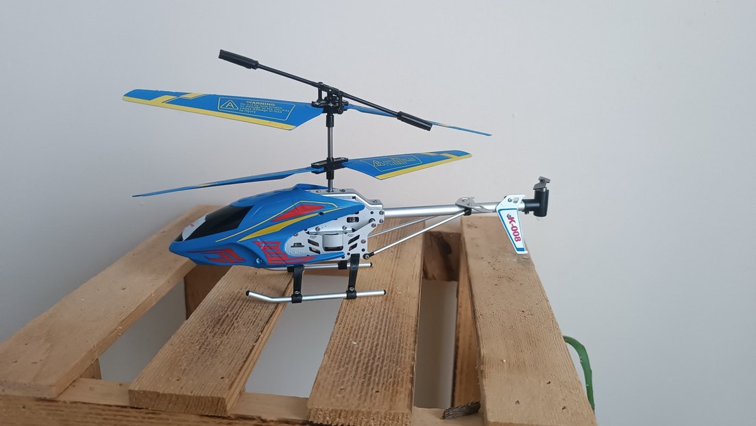Çift rotor kanatlı ve hafif metal gövdeli renkli mavi uzaktan kumandalı helikopter bataryası yoktur herseyı sağlam pılıtak ucur