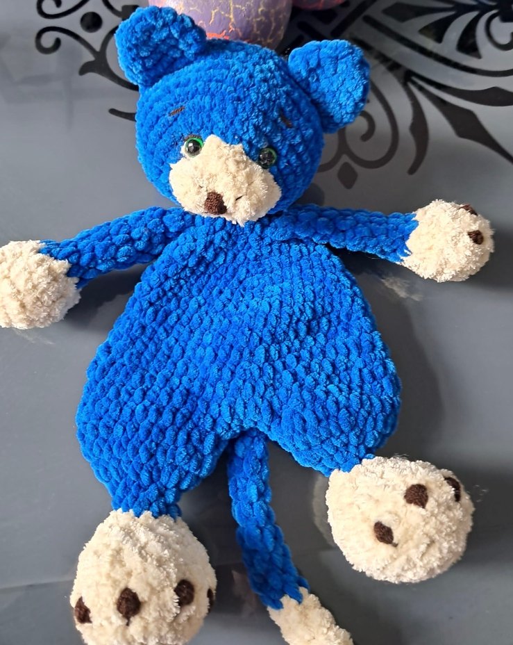 Renkli detaylara sahip, dokulu kumaştan yapılmış yumuşak mavi peluş ayıcık. Orjinal el örgüsü