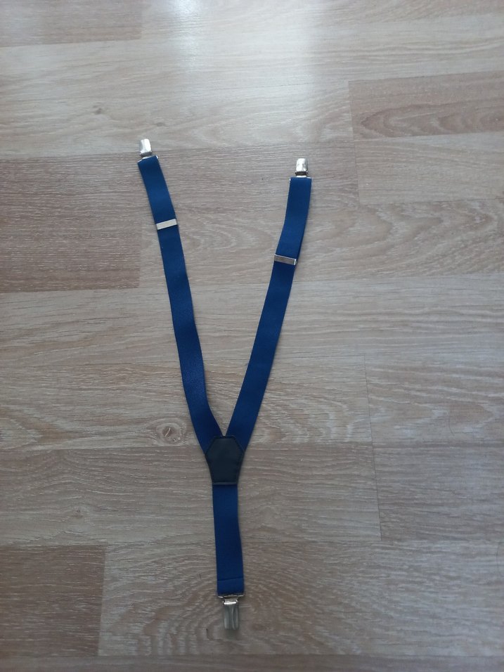 Mavi renkte metal klipsli çocuk askısı. Trendy casual sokak stili için ayarlanabilir ve rahat.