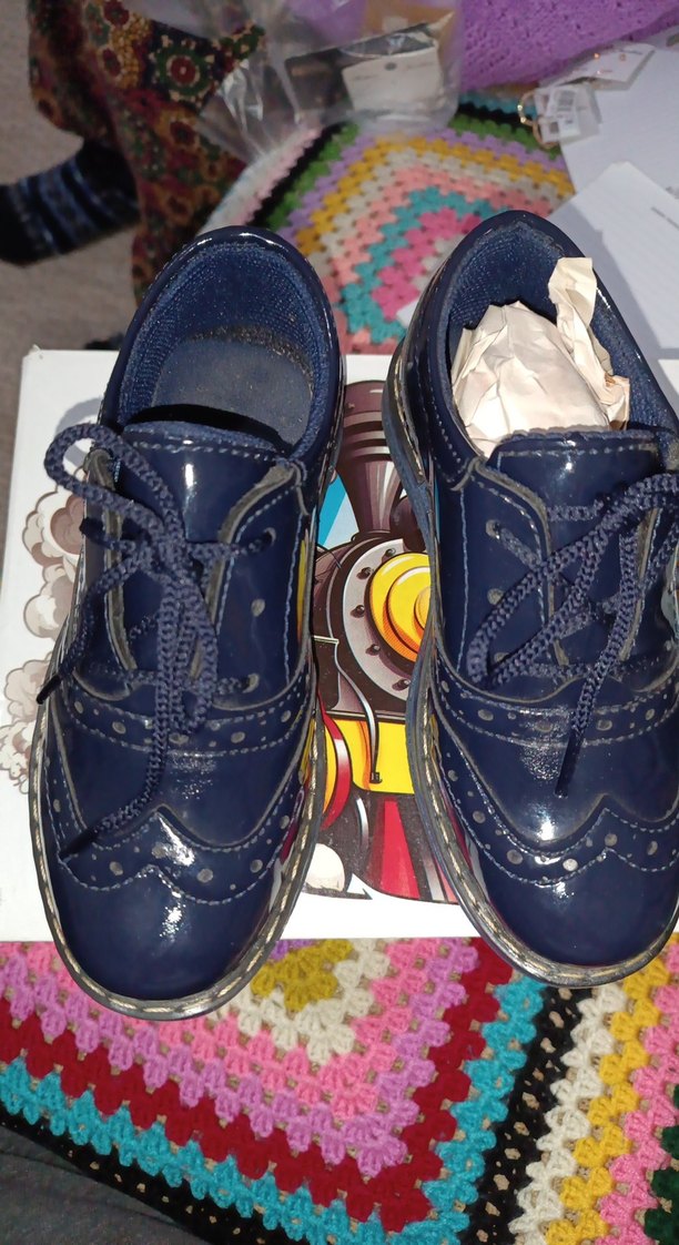 Mavi rugan görünümlü, bağcıklı ve baskılı desenli erkek çocuk ayakkabısı, kauçuk malzemeden üretilmiştir.