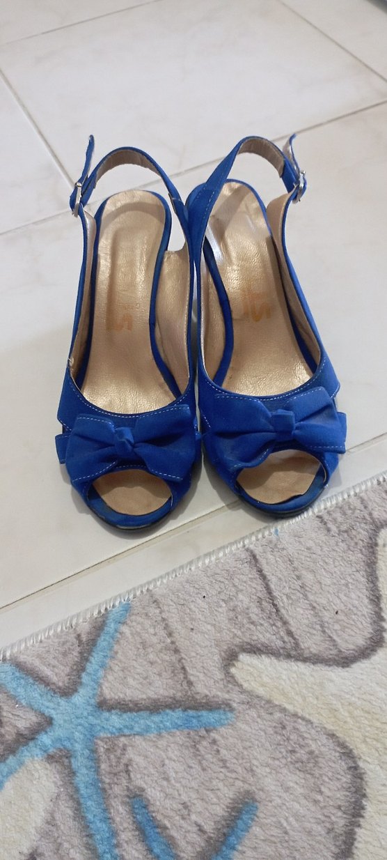 Parlak mavi dolgu topuklu kadın abiye ayakkabı, toka ve fiyonk detaylıdır. Kauçuk malzemeden yapılmış, minimalist ve klasik tarzda parti için uygundur. 1-2 defa giyildi.