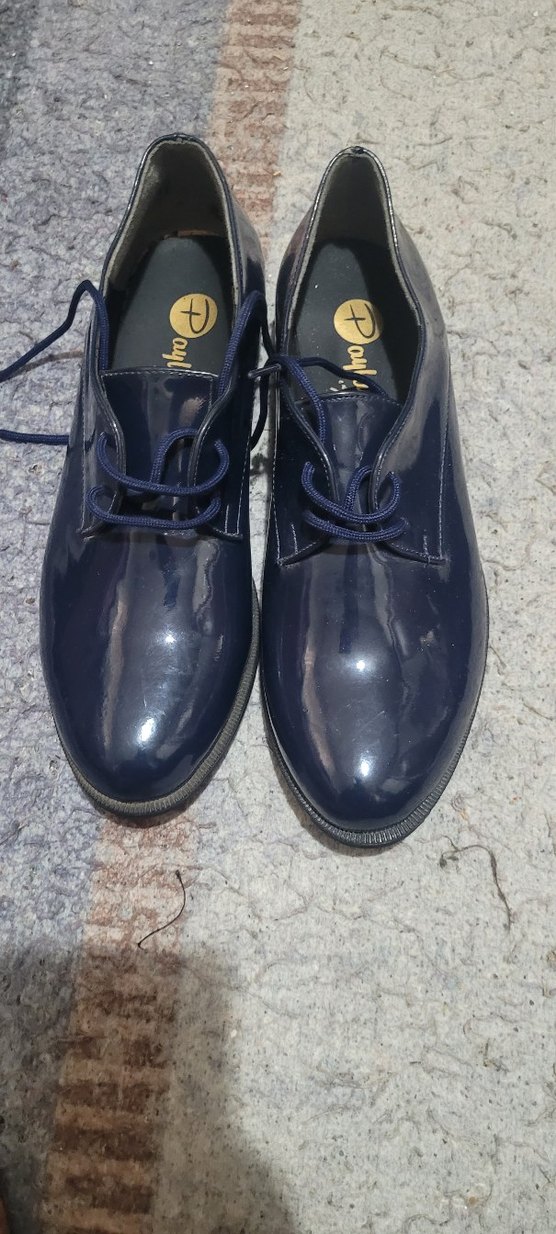 Parlak mavi rugan yüzeye sahip, stiletto ve bağcıklı klasik erkek ayakkabısıdır. Kauçuk malzemeden üretilmiş, ofis için uygundur.