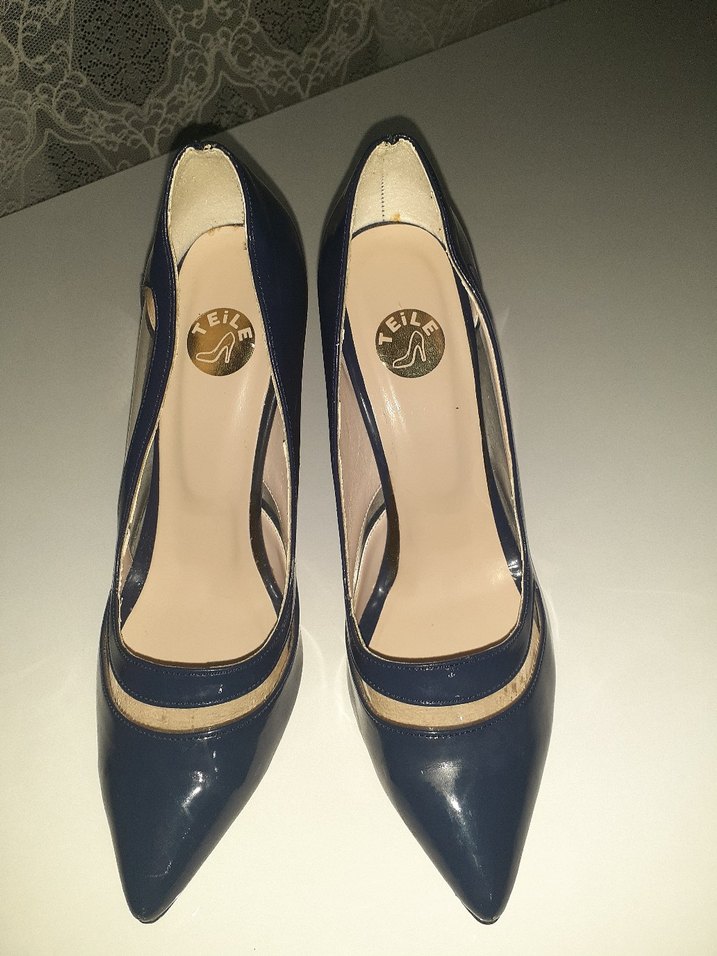 Parlak mavi tokalı stiletto topuklu ayakkabılar, modern klasik tarzda ve dayanıklı kauçuk malzemeden, romantik akşamlar için uygun.