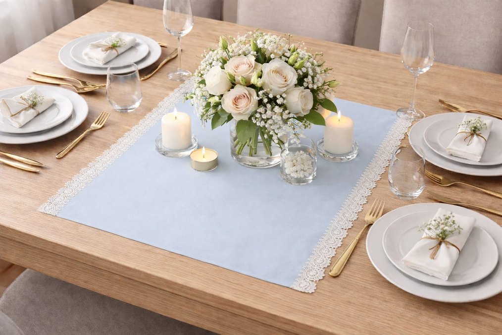 mavi renkte iki kenarı beyaz dantelli saten runner.. 71*78 ölçülerinde.. yeni üründür..