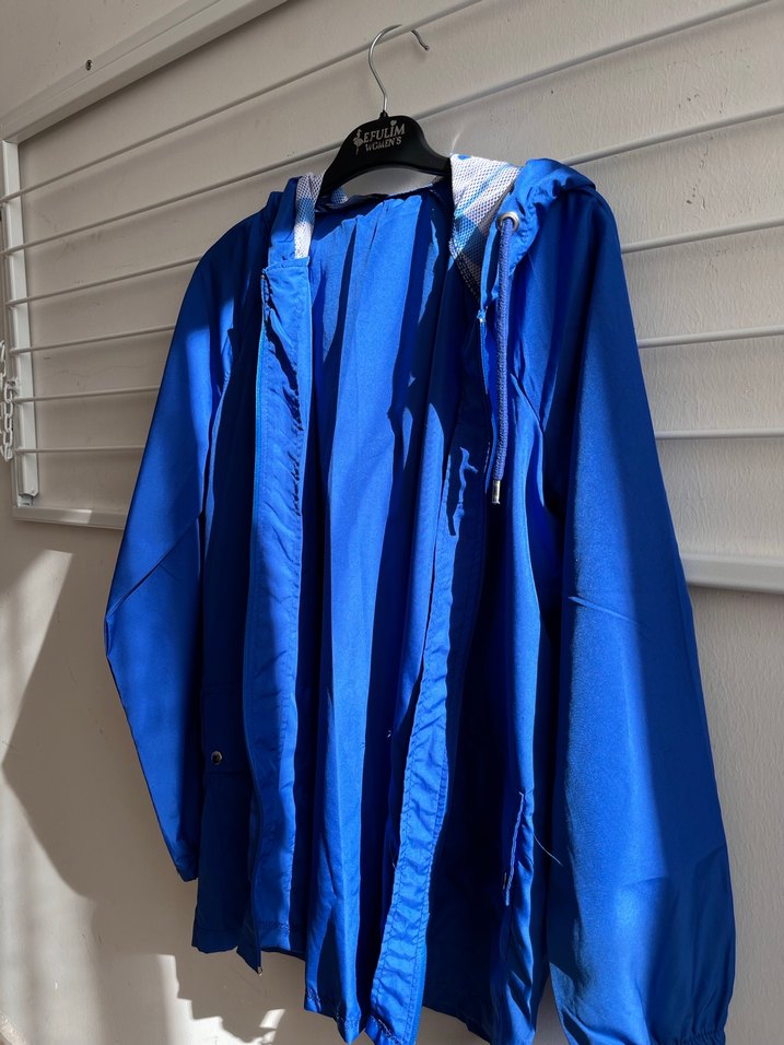 bol kesim ve uzun kollu, yumuşak fleece kumaştan yapılmış, parlak mavi renkli, drapeli rüzgarlık oversize