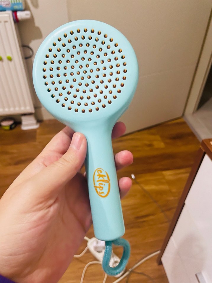 Mavi saç fırçası, kurutma sırasında hava akışını kolaylaştıran delikli tasarıma sahiptir. Rahat sapı ve asma halkası vardır. Eklips dişleri içeri girer açma kapaması var fazla aldığım için satıyorum bir kez kullanıldı