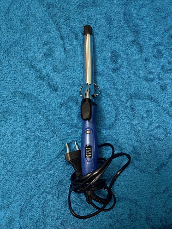 Ayarlanabilir sıcaklık kontrolü ve kelepçesi olan mavi saç maşası. Elektrikli kullanım için kablosu bulunur. yenidir.