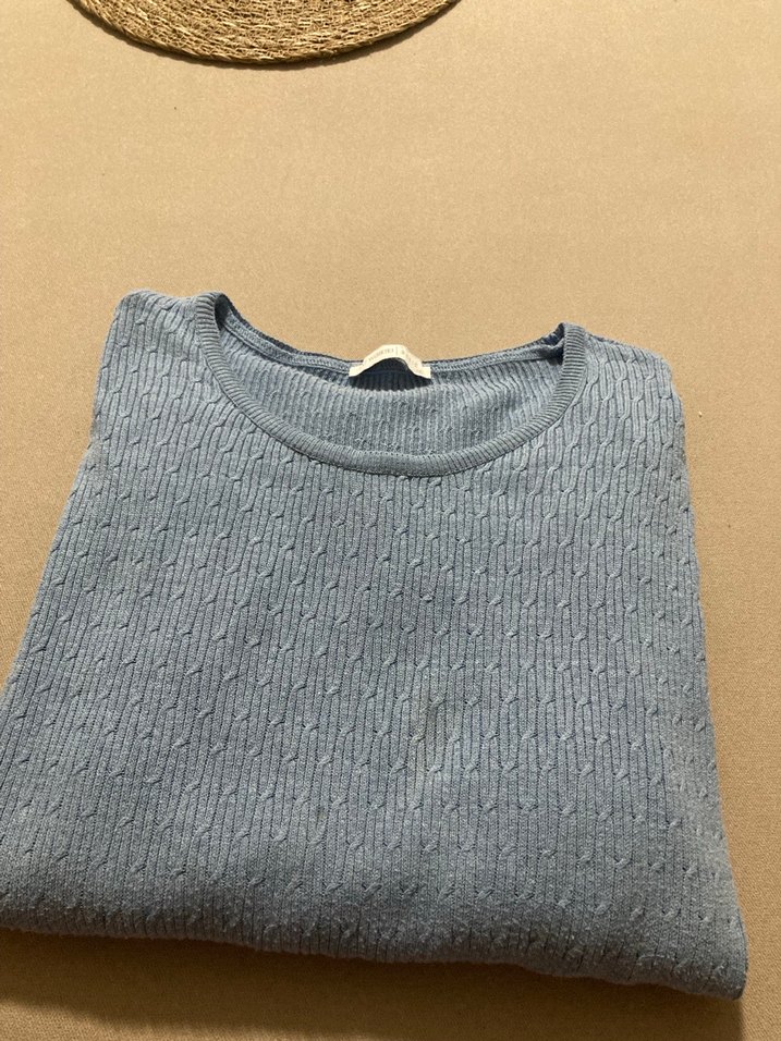 Mavi renkli, bisiklet yaka ve uzun kollu örgü kazak, rahat ve salaş kesimiyle günlük kullanıma uygundur.