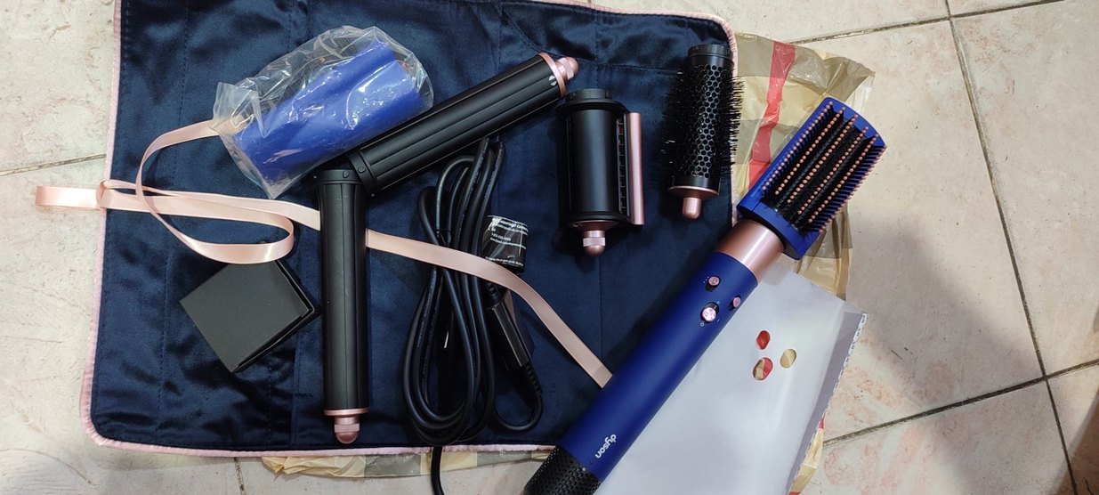 Mavi saç şekillendirici seti, kıvırma, düzleştirme ve fırçalama için farklı başlıklar içerir, şık tasarıma ve kolay kullanıma sahiptir. ♀️