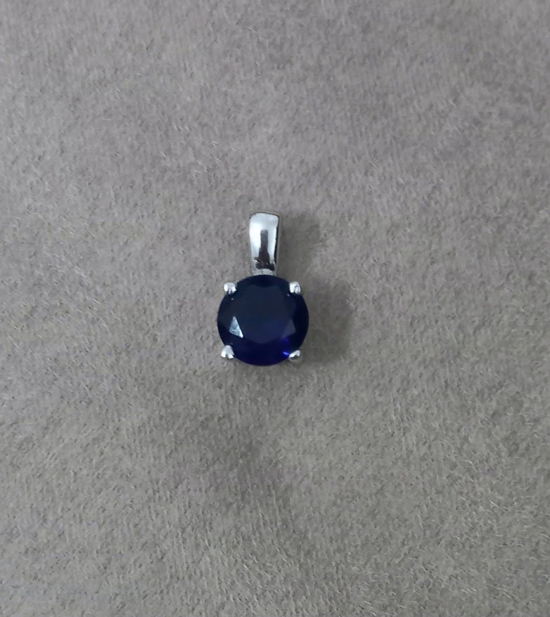 Günlük kullanıma uygun, parlak, 925 ayar gümüş, yuvarlak mavi taşlı çağdaş kadın kolye ucu. 1.4 gram, damgalı.