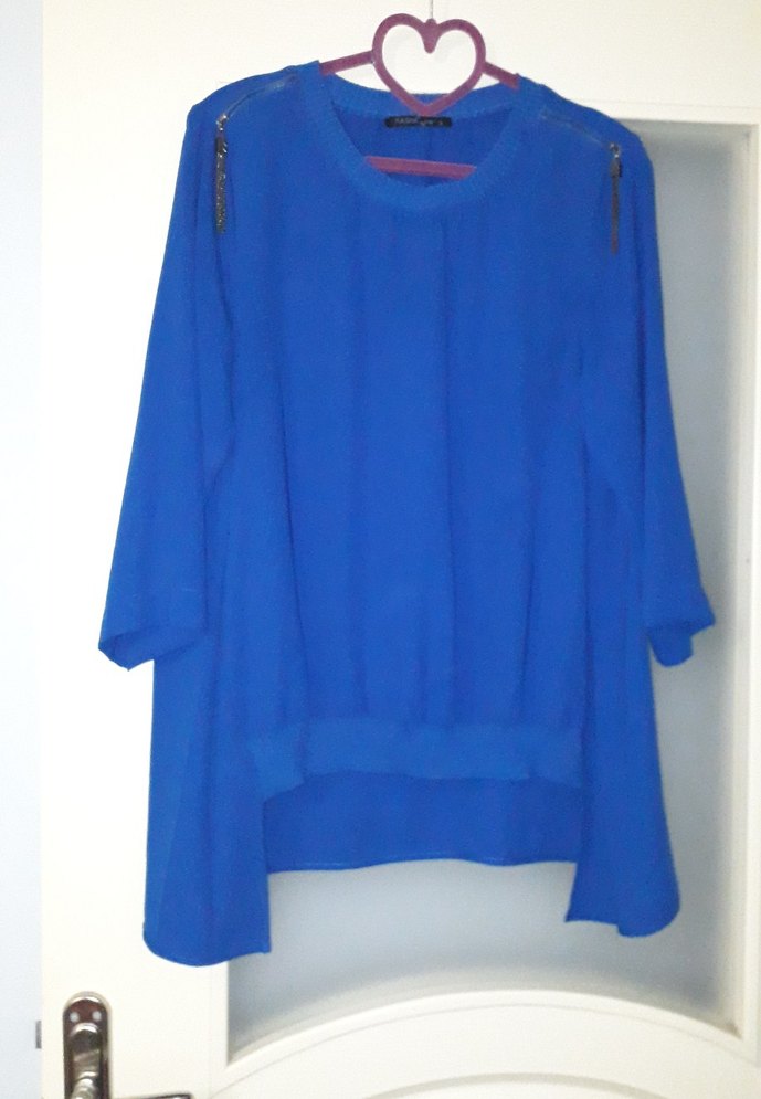 Mavi renk, uzun kollu, yuvarlak yakalı salaş kadın bluz. Drapeli tasarıma sahip, yumuşak ve sıcak kumaştan üretilmiştir.