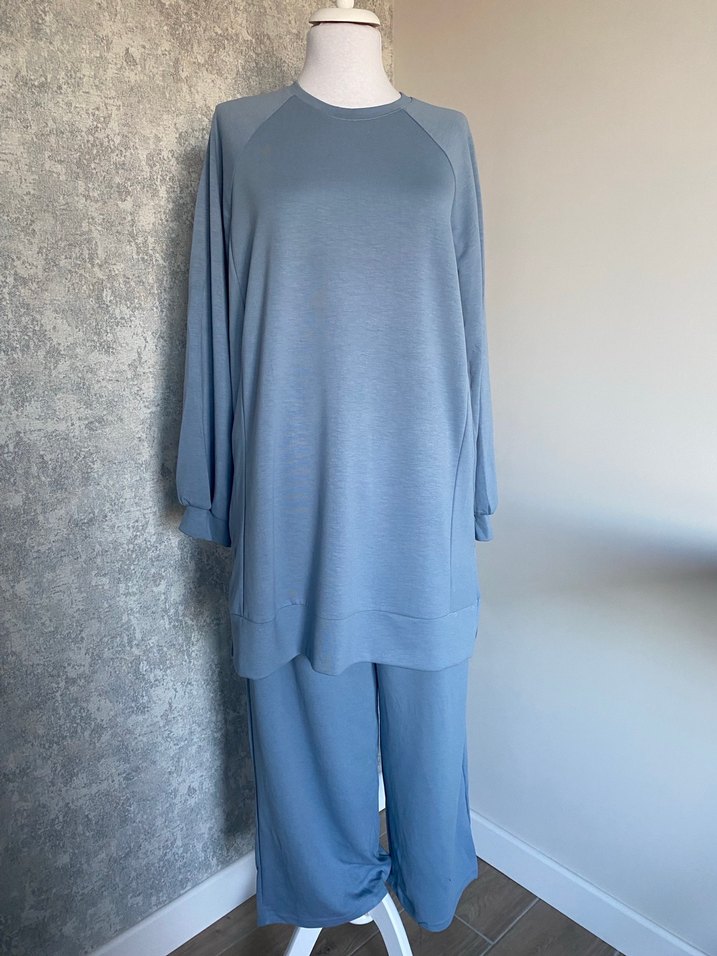 Mavi-gri renkte, uzun kollu, bisiklet yaka ve salaş kesime sahip kadın eşofman takımı. Yumuşak ve sıcak kumaştan üretilmiştir, rahat ve şık bir görünüm sunar.