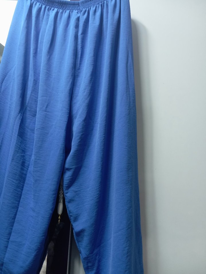 Uzun boy, mavi renkte, satenimsi kumaştan yapılmış, salaş ve drapeli kadın pantolonu. Günlük sokak giyimine uygundur.