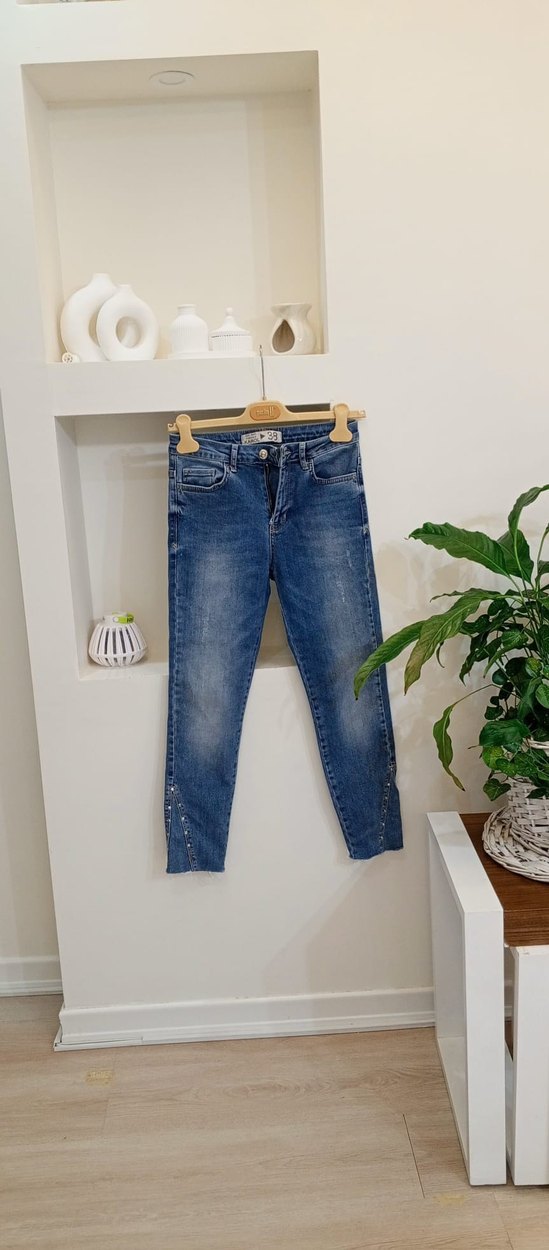 detaylara ve batik desenine sahip mavi salaş mini denim pantolon. Günlük rahat kullanıma uygundur.