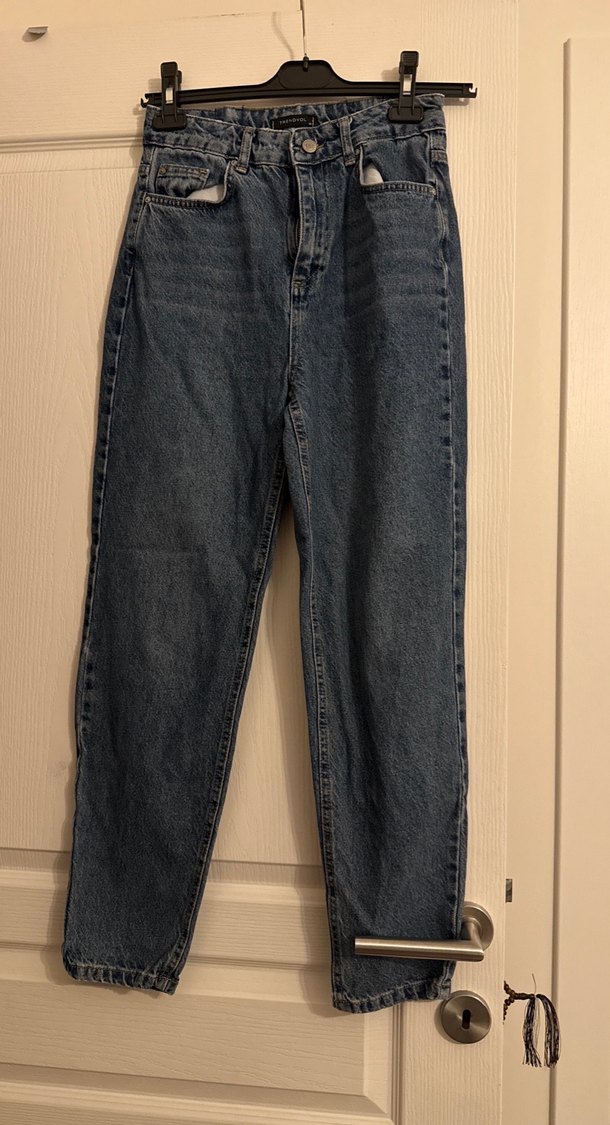 mavi renkte, salaş kesim ve midi boyda kot pantolon. Rahat ve şık görünümüyle günlük sokak stiline uygundur.