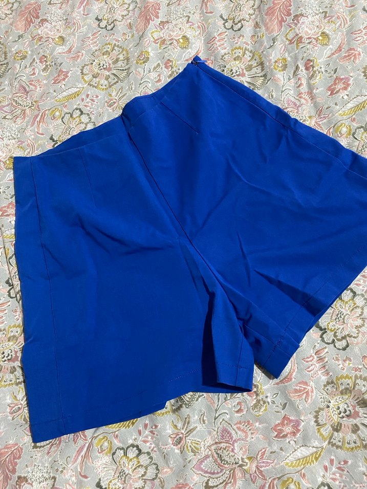 Mavi, saten dokulu, salaş kesim mini şort. Dökümlü tasarımıyla dış mekanlarda rahat kullanım sağlar.