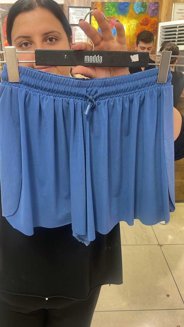 Mavi, parlak sentetik kumaştan yapılmış, salaş kesim ve drapeli mini hamile şortu. Günlük rahat kullanıma uygundur.