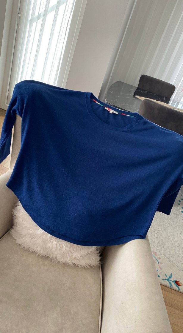 Mavi renk, yuvarlak yaka ve uzun kollu sweatshirt, salaş kesim ve dökümlü tarzıyla rahat ve şık. Parlak yüzeyi ve yumuşak dokusuyla günlük kullanıma uygun.