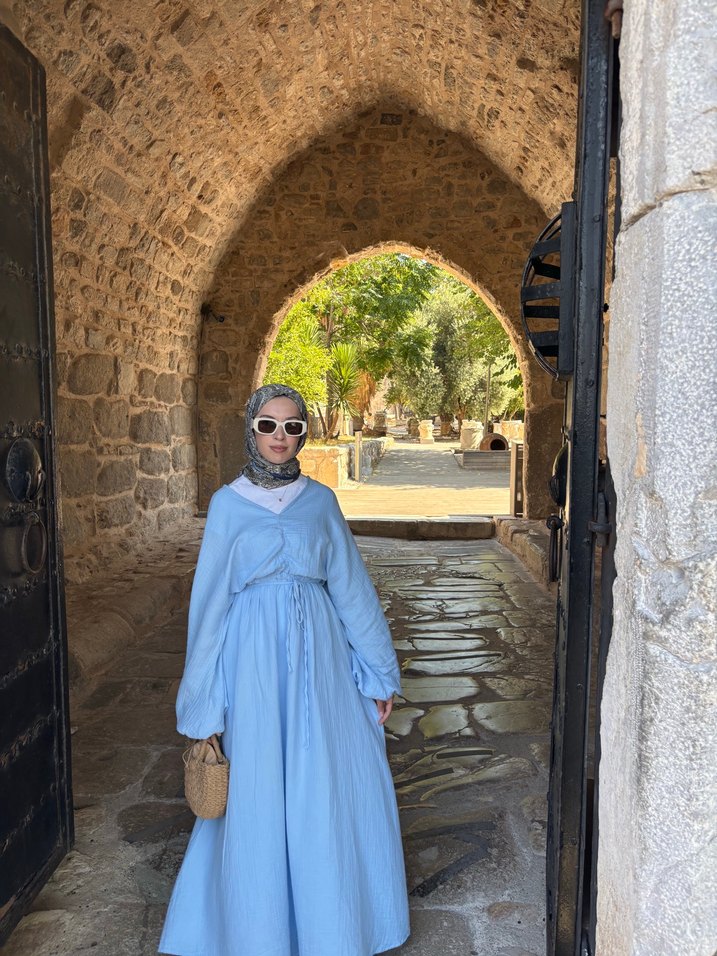 Pastel mavi renkte, salaş kesimli ve drapeli uzun elbise. Yumuşak keten kumaştan, uzun kollu, yüksek yakalı ve hafif batik desenlidir, sade sokak stili için uygundur.