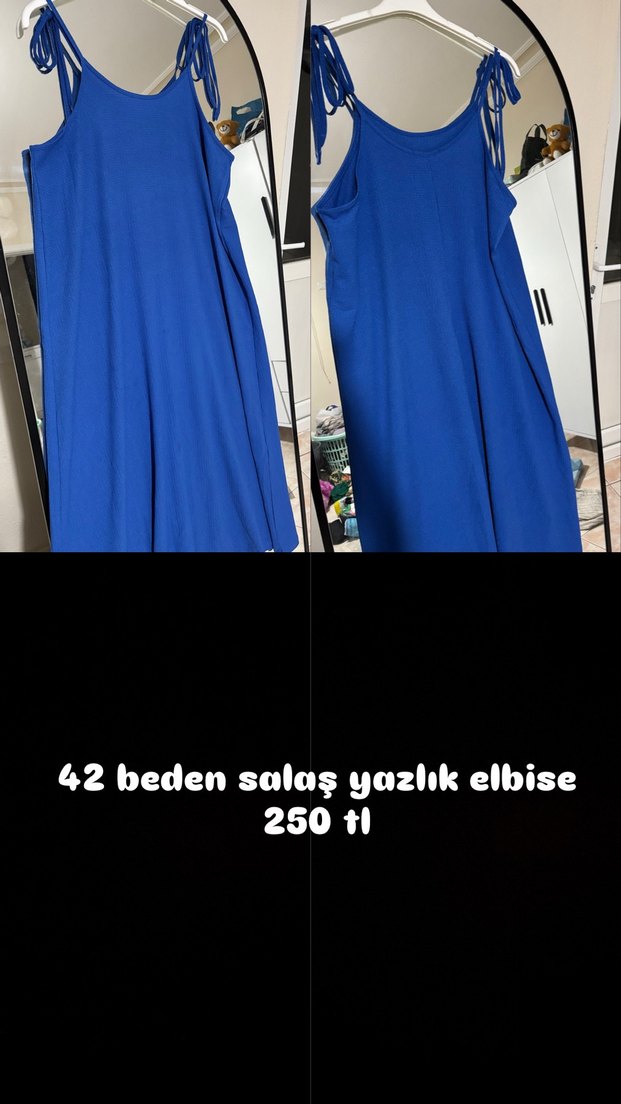 Koyu mavi, askısız ve kolsuz, salaş kesim uzun elbise. Sentetik kumaştan,, sportif sokak tarzı için uygun. 42 beden.