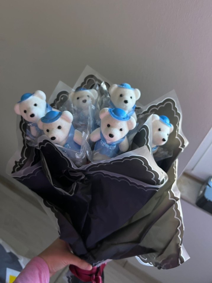 Mavi şapkalı küçük peluş ayıcıkların siyah ve koyu renkli kağıtla sarıldığı buket. Yumuşak ve sevimli bir hediye seçeneği.
