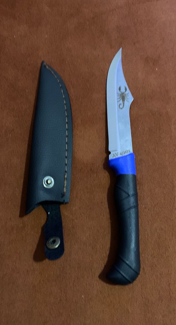 Mavi ve siyah saplı, kavisli bıçağa sahip, yanında siyah deri kılıf bulunan bıçak.