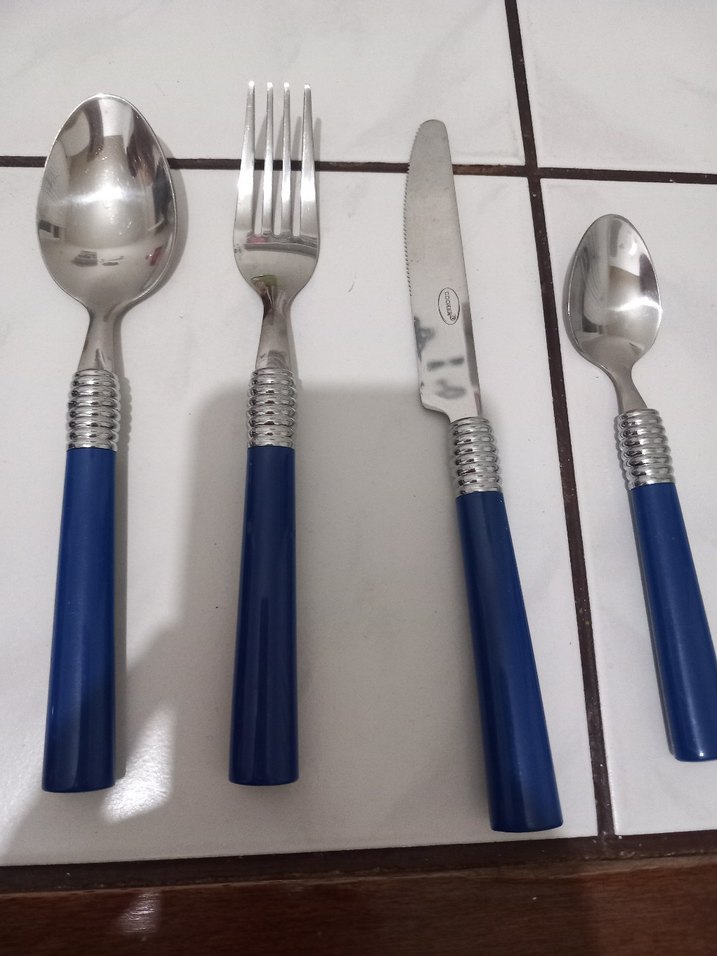 48 li çatal, kaşık, bıçak ve tatlı kaşığı seti mavi saplara ve gri detaylara sahiptir. Saplar pürüzsüz yüzeylidir. kepçe seti de mevcuttur